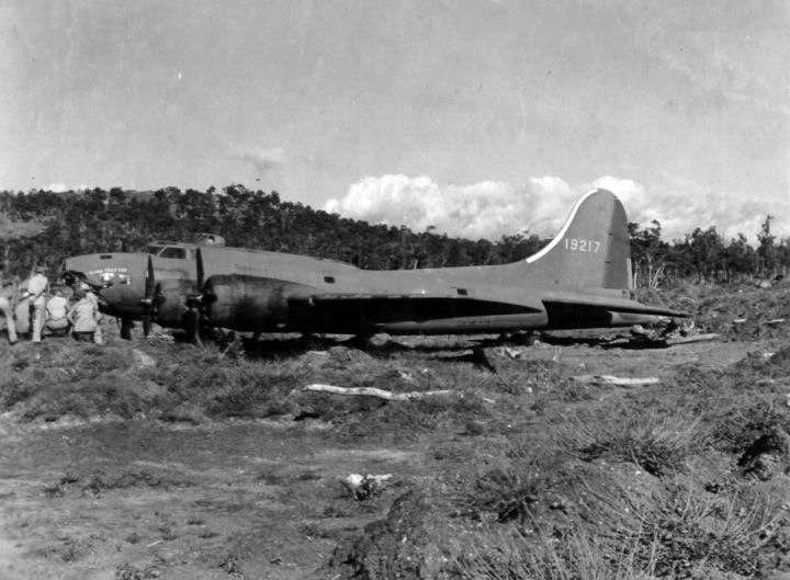 B-17E Flying Fortress #41-9217, "Globe Trotter", of the 7th Bombardment Group was damaged when it made a forced landing at Plaine Des Gaiacs, New Caledonia on 27 October 1943.