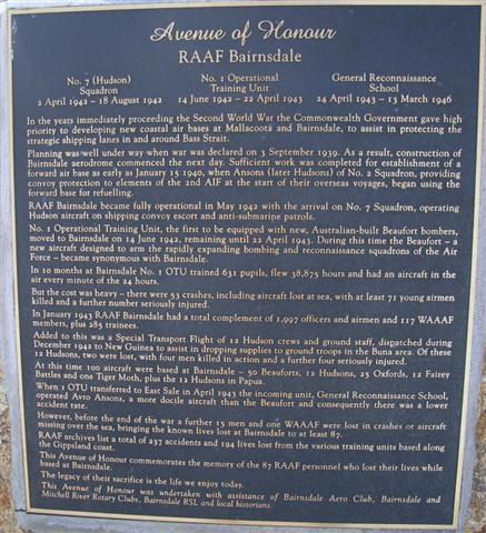 The RAAF's General Reconnaissance School and its Avro Ansons was based at Bairnsdale Airfield from 24 April 1943 until 13 March 1946.