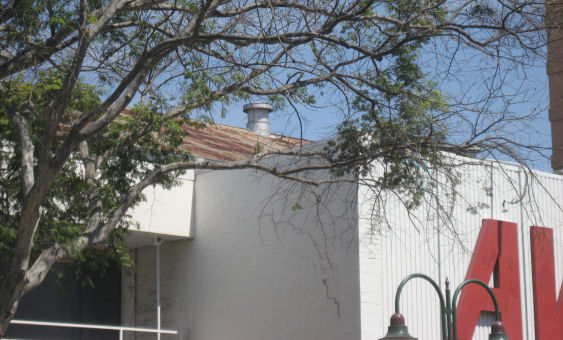 From across the road you can see a row of old ventilators on the roof of the building behind the false facade