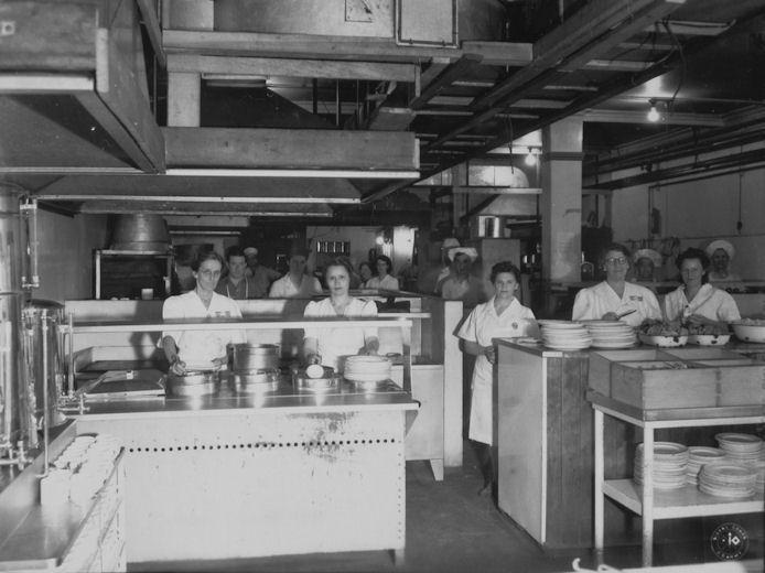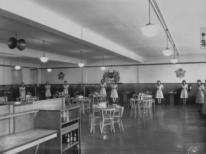 The American Centre became a home for American forces particularly those visiting Brisbane from New Guinea and north Queensland. It provided them with a place where they could bathe, shave and eat in comfort. There were reading and writing rooms, bowling alleys, game rooms, shower rooms and a snack bar which served hundreds of hamburgers and cups of coffee every night. The American Centre included accommodation for several hundred men.