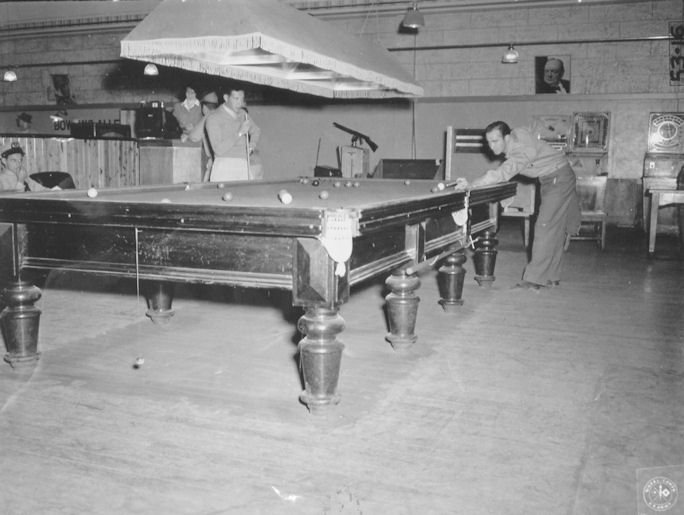 Private Thomas F. Mamboy, St. Louis, MO plays a game of pool on one of ten tables (26 Apr 1944)