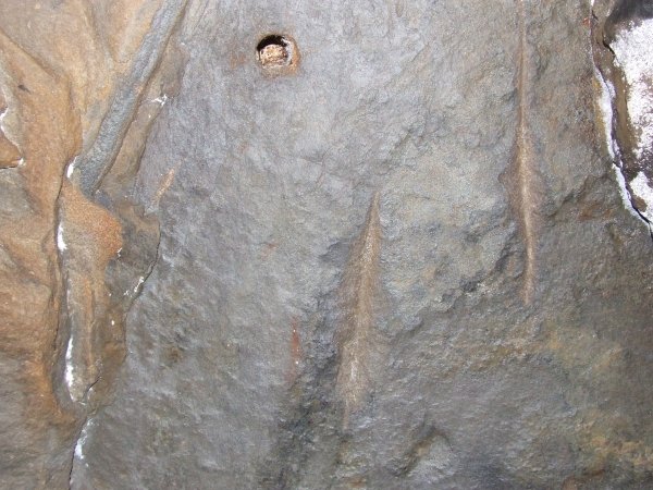 On leaving the tunnel Steve noticed a core hole in the ceiling in what looks like a basalt seam. Apparently there was an old basalt mine nearby in the 1930's. Could this possibly be a test mine to gauge the size of the basalt seam. The main rail tunnel was built in the 1890's. Steve said that both locations were extremely hard to hike to with no nearby road access