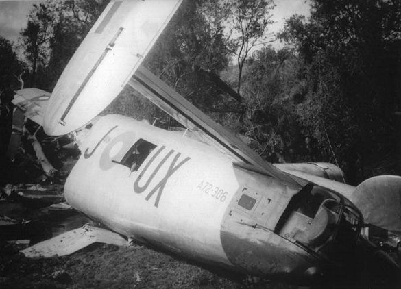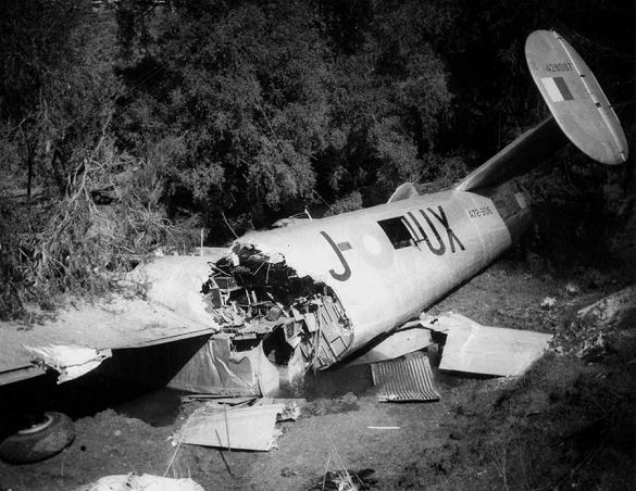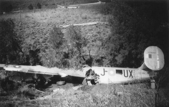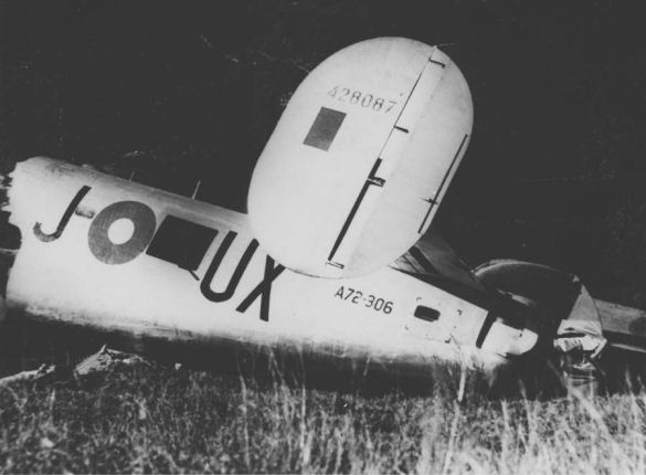 B-24J-5-NT Liberator, A72-306, Code J-UX (#44-28087) of 99 Squadron RAAF crashed during take off from Amberley Airfield at approximately 3:40pm on 16 August 1945. Unfortunately the B-24 Liberator's brakes were applied too soon before the aircraft was safely in the air. As a consequence the nose of the aircraft dipped heavily into the runway causing the nose wheel assembly to collapse and also shearing the hydraulic lines for the engine controls. The aircraft subsequently skidded off the south east end of the runway into a 60 feet deep gulley and broke in half.