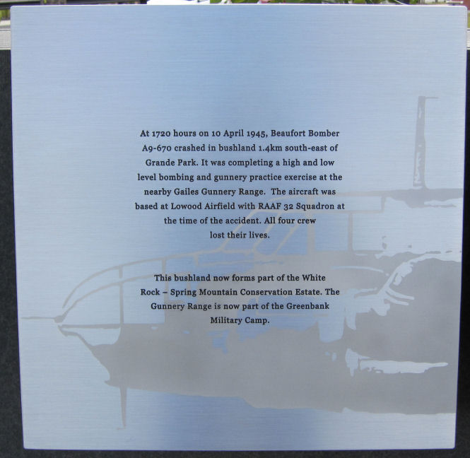 At 1720 hours on 10 April 1945, Beaufort bomber A9-670 of 32 Squadron RAAF, crashed at Greenbank, SSW of Brisbane, killing the crew of four. It crashed after completing an air to ground gunnery practice exercise at the nearby Gailes Gunnery Range (also known as the Gailes Armament Range or Gailes Bombing Range) which is now part of the Greenbank Military Camp.
