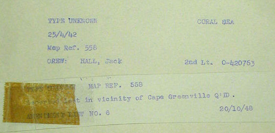 The rest of the flight made emergency landings in a variety of locations. Lt. John Jacobs made a wheels up landing. Lts. Morris, Quandt and Nowlin made successful wheels-down landings. Lt. William McGovern in Airacobra #41-7210, made a forced landing south of Murdoch Point. 1st Lt. Jack Hall in P-39D #41-6770, and 2nd Lt. John Long were killed, both reported as missing in the Cape Grenville area.