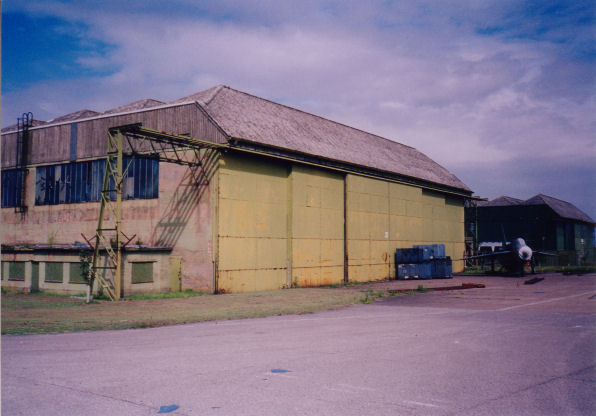 Binbrook airfield. Note the Lightning fighter jet at right of photo near hangar