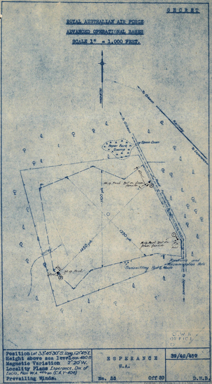 A Minute Paper signed by the Secretary of the Air Board dated 3 February 1939, confirmed that the Air Board considered a landing ground was necessary at Esperance for defence purposes, although it was not in a high order of priority. It was to be used as a refueling point and emergency landing ground for aircraft operating in the defence of trade and shipping in the Cape Leeuwin and South-western area. The Air Board intended to request the Civil Aviation Department to make provision in that Department's estimate for the year 1939/40, for the sum of money necessary to give the required assistance to the local Road Board to prepare the ground.