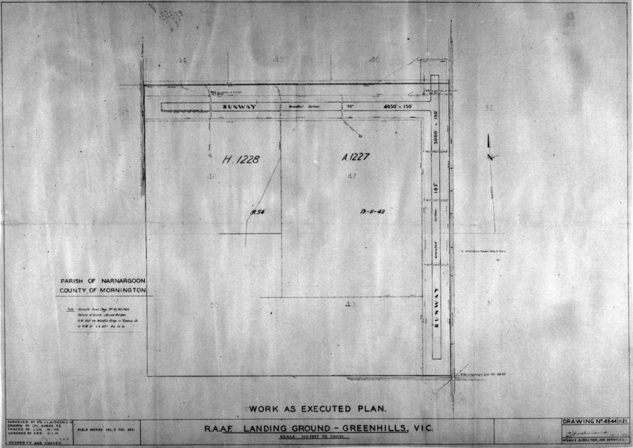 On 31 May 1942 an inspection of various sites for a new satellite airfield at Greenhills was carried out. By 31 July 1942, eight possible sites had been selected and marked out. Mr. J.K. Robertson and Mr. L. Hogan inspected the selected site on 14 October 1942 and witnessed construction of the two runways. Mr. J. Eldershaw was in charge of camouflaging the location. 16 hideouts were developed.