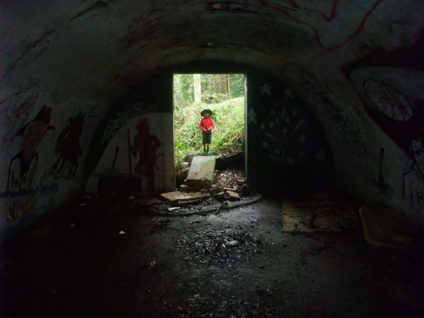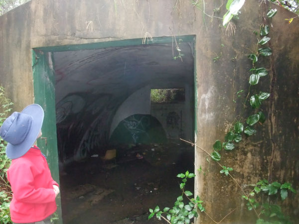 Huon Templeton silhouetted in the entrance of the WWII bunker