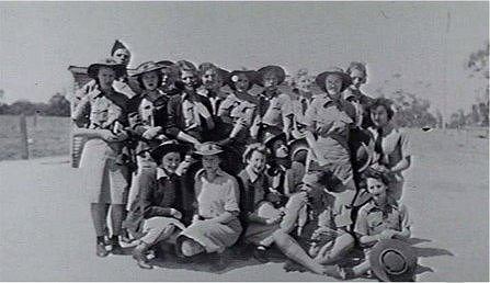 Left to Right: Back Row: Unknown, Elspeth Scott, Unknown. Centre Row: Lorna Russell, Bella Roberts, Dorothy Roberts, Unknown, Bet Probert, Betty Watkins, Iris Ball, Myra Pattullo (or Pettulo), Lois Jones. Front Row: Dot Lovell, Addie Williams, Ursula Regan, Joan Lucas, Dave Rumball, Pam Collins |