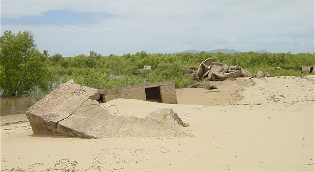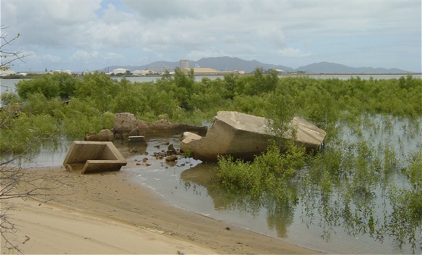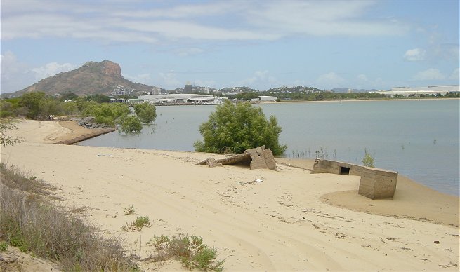 There are the remains of a number of WW2 concrete bunkers on the southern side of the mouth of Ross River in Townsville in north Queensland. One is still intact, another is intact but rolled over on its roof and the rest have been demolished, possibly after they had fallen into the sea after the foreshore had been washed away over the years. These belonged to 476 HAA Gun Station Ross River of the 16th HAA Battery.
