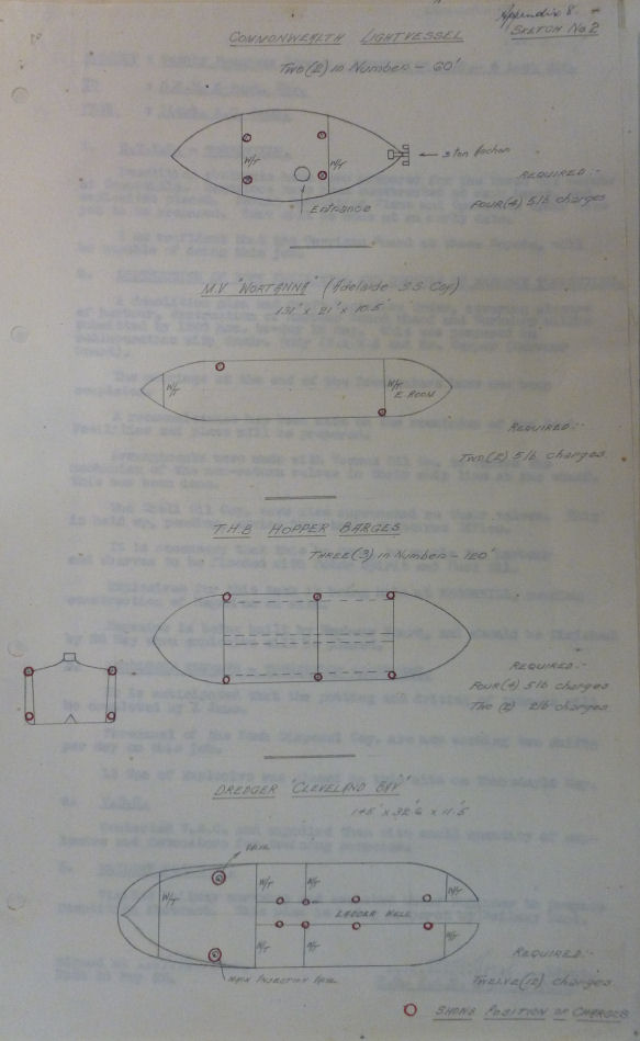 WHARF AND FACILITIES ALONG EASTERN BREAKWATER:- (a) 2 – 20 TON TRAVELLING CRANES. METHOD (b) TRANSFORMER HOUSE METHOD (c) OVERSEAS CARGO SHED NO. 4 METHOD Ground and upper floor to be soaked with petrol, and ignited. (d) 3 – 3 TON, 1 – 5 TON AND A MOBILE CRANE METHOD (e) SHED NO. 3 METHOD (f) AUSTRALIAN S.S. PR. LTD. SHED NO. 2 METHOD (g) ADELAIDE S.S. CO. SHED NO. 1 METHOD (h) FERRY LANDING METHOD (i) WHARF ALONG EASTERN BREAKWATER METHOD PIER NO. 1 AND FACILITIES METHOD (k) BURNS, PHILIP & CO. LTD SHED NO. 5 METHOD (l) PIER NO. 1 METHOD TASKS IN VICINITY OF WHARF:- (m) MOLASSES STORAGE TANK AND VALVE HOUSE METHOD To Valve House 12 lbs. of explosives allotted to be used in 3 lb. charges. Further damage with sledge hammer. (n) STATIC WATER SUPPLY (3 STORAGE TANKS) METHOD (o) HARBOUR BOARD STONE CRUSHER METHOD Steam engine. Destroy the cylinder (steam end) with a 4 lb. charge. 10 lb. charge placed in jaws of crusher and spare jaws dumped into Harbour. (p) TWO (2) STEAM DRIVEN CRANES METHOD A 3 lb. charge placed under centre of crankshaft. (q) LOCOMOTIVE SHED METHOD (r) TRANSFORMER HOUSE METHOD (s) PILEDRIVER PLANT METHOD (t) SHED NO. 6 METHOD (u) COAL DUMP AND SHEDS 7 – 13 (INCLUSIVE) METHOD (v) ROAD AND RAILWAY CRATERING METHOD |