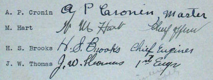 Rescued Crew members of the City of Rayville, Master A.P. Cronin, Chief Officer M. Hart, Chief Engineer H.S. Brooks and First Engineer J.W. Thomas wrote a letter of appreciation dated 16 November 1940 to "the Right Honorable R.G. Menzies, Prime Minister of Australia which read as follows:-