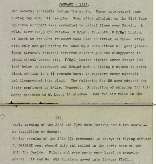 Records on the National Archives of Australia site show that 76 Squadron RAAF experienced Japanese air raids at Strauss Airfield early on the mornings of 22nd and 23rd January 1943 both lasting about two hours. There were no casualties or damage.