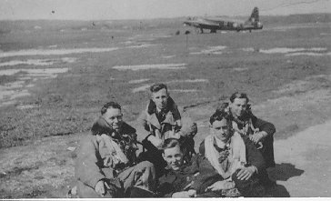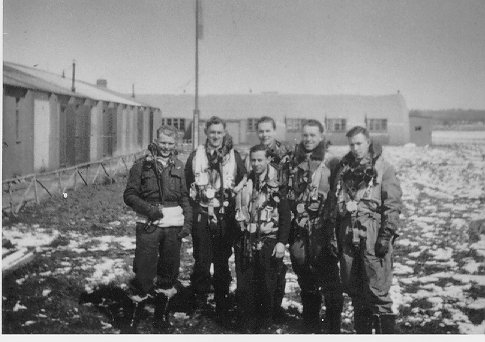 winter 1942/43 Left to right: Unknown instructor from OUT, Norman Conway (N), Harry 'Bud' Ward (AG), Lindsay Greenaway (BA), Francis Randall (P), Harry Petersen (WOP) (short fellow in front - they used to tease him about his height) |