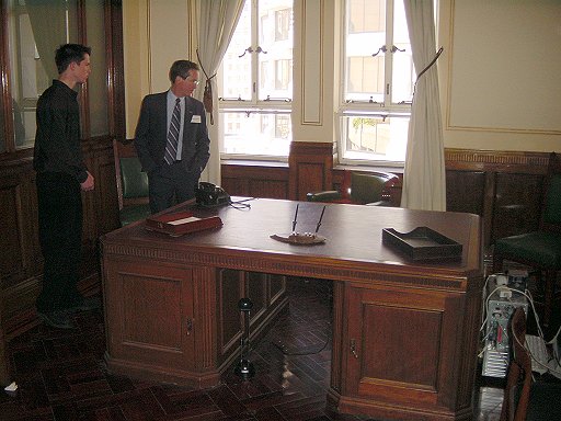 Stage 1 of the MacArthur Museum Brisbane was officially opened by Peter Beattie, the Premier of Queensland on 15 August 2004, the 59th anniversary of the end of the war in the Pacific. The MacArthur Museum Brisbane is located on the 8th Floor of MacArthur Chambers on the corner of Queens Street and Edward Street, Brisbane, in south east Queensland, Australia. MacArthur Chambers which is now an exclusive apartment building, was originally the old AMP building where General Douglas MacArthur and his senior staff were located in MacArthur's General Headquarters, Southwest Pacific Area (GHQ, SWPA). MacArthur's office (Room 806) and that of his deputy, General Richard Sutherland (Room 807) have both been restored as part of the Museum. MacArthur and Sutherland had both earlier shared Room 809 on the same floor. |