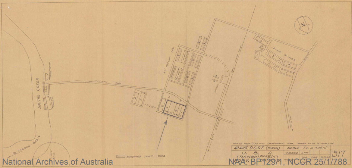 Cairns was identified as a major transhipment port to handle much of the war supplies arriving in north Queensland from the USA. Initial plans for the Transhipment Port facilities were quite large, including about 2 kilometres of wharves, 12 wharf stores buildings, over 40 warehouses and drainage, sewerage and camp facilities for approximately 40,000 US troops. In addition various roads and a railway siding were required. The nearby Smith's Creek was to be dredged to a depth of 8.5 metres at low tide and a large turning basin was to be provided.