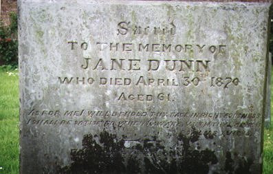 ST. PAUL'S CHURCHYARD, FILLEIGH Sacred to the memory of Jane Dunn, who died April 30th, 1870, aged 61 yrs, 'As for me I will be hold thy face in righteousness.' 'I shall be satisfied when I wake with thy likeness' PSALMS XVII 15 Erected by her son Jerry |