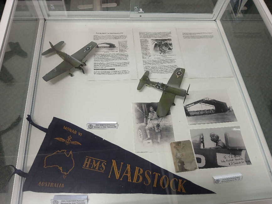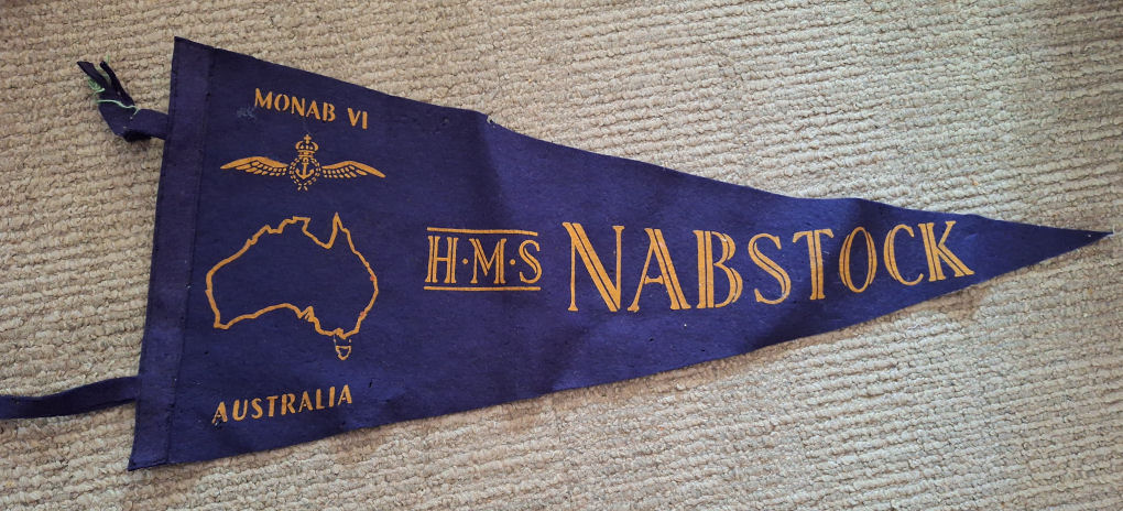 I was contacted by Joan Tweedale in November 2024 to say that she had the above HMS Nabstock pennant which had belonged to her father Victor Daniel Townsend, who had arrived in Australia on board the MV Stirling Castle with the British Pacific Fleet and served at HMS Nabstock at Maryborough in Queensland. I promised to find a suitable home for the pennant to be displayed. I contacted David Geck at the Maryborough Military Aviation Museum to see if they would be interested in having the pennant. One of their members picked up the pennant on 17 December 2024 and it is now on display in the Maryborough Military Aviation Museum. See the photo below.