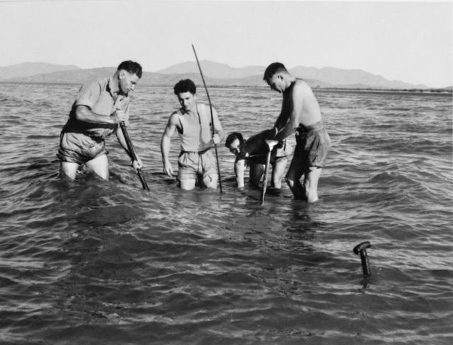 No! They aren't standing on a submarine in Cleveland Bay! It's an Australian Army team attempting to recover an unexploded 500 lbs bomb from shallow waters in the harbour following a raid by the Japanese. Lieutenant William George Solomon Huxley, Sapper Mens, Corporal Smith and Sapper Frederick Van Doorn looking for an unexploded Japanese bomb on 28 July 1942. |