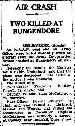 Wirraway A20-462 crashed and caught fire about 5 miles south-west of Bungendore in NSW at 1050 hours E.A.S.T. on Friday 27 February 1942 and killed 24 year old Pilot Officer Frederick William Powell (405529) of the RAAF School of Army Co-operation in Canberra and 25 year old Captain William John McCutcheon of the 51st Australian Infantry Battalion AIF, during a map reading exercise. The probable cause for the accident was listed as "Obscure" in the "Preliminary Report (External) of Flying Accident or Forced Landing" report.
