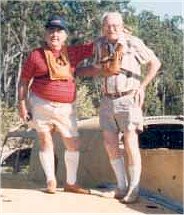 Veterans Ernie Low on the left and Don Moore revisiting the remains of B-25D Mitchell, N5-133 in 1986.
