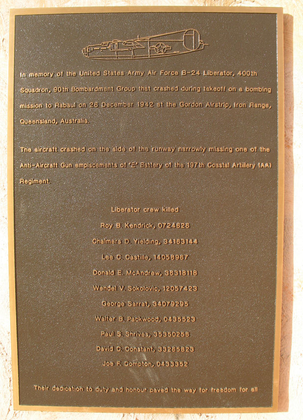 USAAF B-24D Liberator of the 400th Bomber Squadron (Heavy), 90th Bombardment Group, #41-23875, crashed during take-off on a bombing mission from the Iron Range "Gordon" air strip on 26 December 1942 at approximately 10.00pm. Piloted by Lt. Roy Kendrick, the B-24 caught its wing in some trees during the take off. The B-24 hurtled out of control down the runway and crashed "with a sickening roar and blinding flash, followed by a series of huge explosions as the craft's bomb and gasoline load detonated".