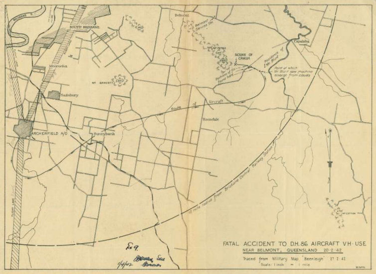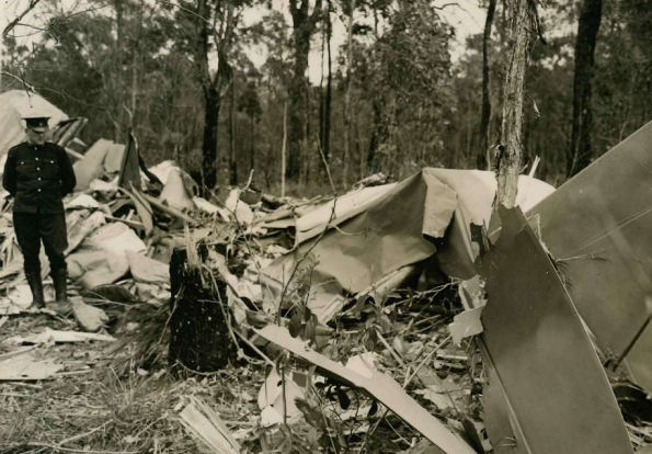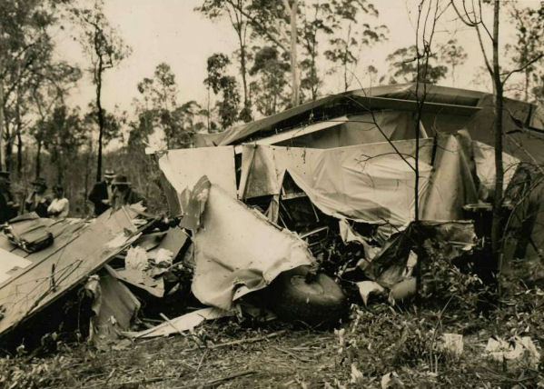 Only a few minutes later news was telephoned to the airport that the aircraft had plunged out of control from heavy cloud, crashing vertically to destruction amongst trees on the slopes of Mount Petrie near Belmont on the outskirts of Brisbane. All on board were killed instantly.