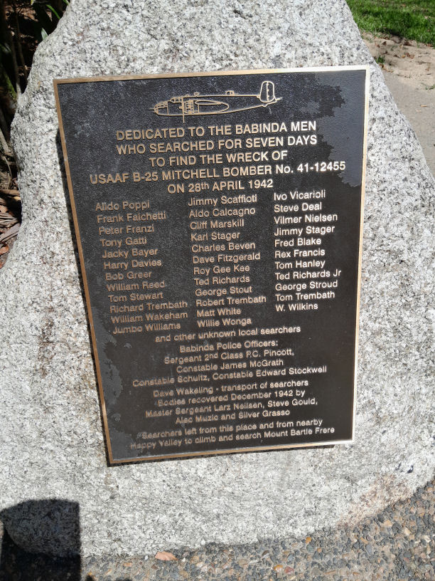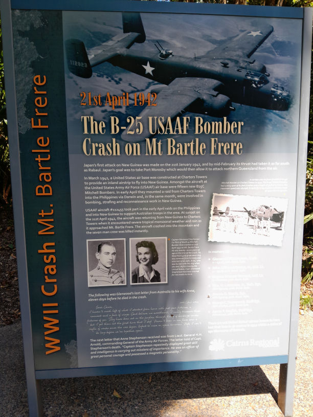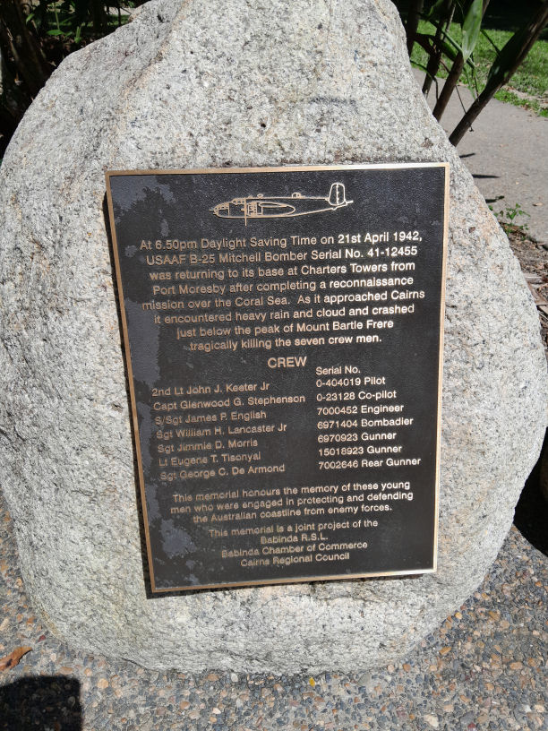USAAF B-25C Mitchell medium bomber #41-12455, of the 90th Squadron of the 3rd Bomb Group based in Charters Towers, crashed into Mount Bartle Frere near Babinda in north Queensland at 7 p.m. on 21 April 1942 while returning from a search mission in the Coral Sea. They flew into a blind gully which lead to the peak of Mount Bartle Frere. They were searching for the Japanese fleet which was destined to take part in the Battle of the Coral Sea a few weeks later.