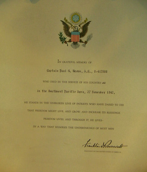 My name is Craig Grude. I'm from Chicago, Illinois. My father was in the 44th Depot Repair Squadron that was stationed for a time near Brisbane, and took liberty there. He spent most of his time in an area of New Guinea called Finchaven. My mother, who passed away this last Christmas, was a war widow. Her husband's name was Lt. Paul G. Brown of the 36th Fighter Squadron, 8th Fighter Group. I have been doing some research on him because of a story my mother always told. He and his wingman were on a mission. The wingman was forced down on some island and Paul landed to check on him. They found mechanical problems with his plane, a P-39 Airacobra and Paul made several runs back to the base to obtain parts. Paul took off after they repaired the plane and when the wingman returned, Paul had not. He was never heard from again.