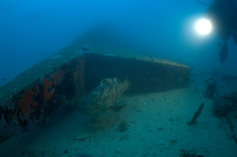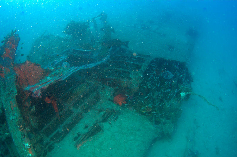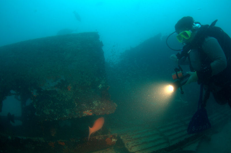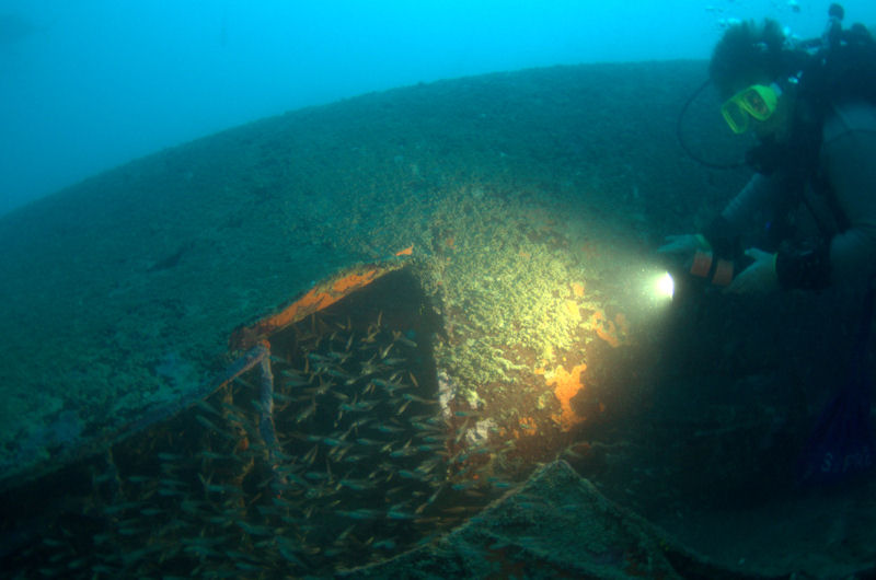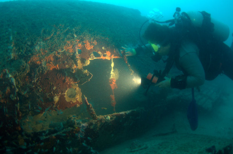 Fuselage lying on its side, diver looking at top at some sort of hatch.