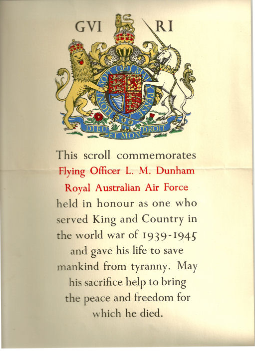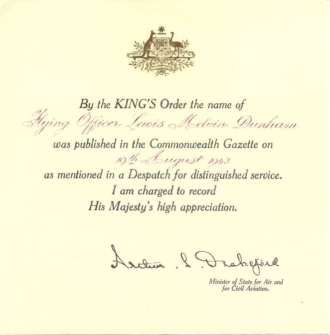 | Navigator | Flying Officer Lewis "Lou" Melvin Dunham (406672) |