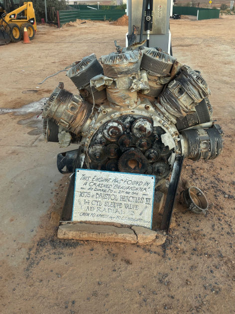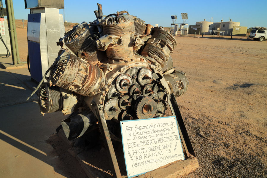 The starboard engine is on display at the Trading Post at Coopers Creek near Innamincka in NE South Australia about 235kms SSE of Durrie. The caption with the motor lists the pilot and navigator. Neil Derrington told me that he looked up the WW2 Nominal Roll and found the particulars for the navigator, Harrold Kelly, then looked up the Brisbane phone book and found one listing for Harrold Kelly, rang the number and was talking to the navigator of the crashed Beaufighter approx 59+ years ago. Neil still cannot believe that it happened that way. The odds of finding a particular person after so long are very high.