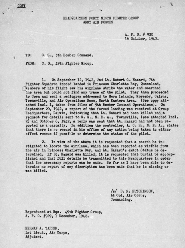 Members of his flight saw his aircraft strike the water. The rest of the flight searched for Lt. Hazard but he was not found. A search of the coastline of Princess Charlotte Bay found no trace of Lt. Hazard.
