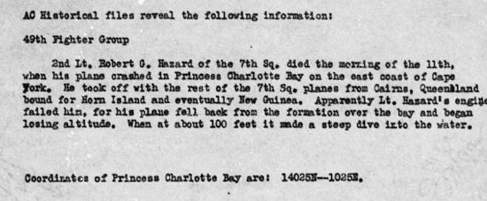 On 11 September 1942, 2nd Lieutenant Robert G. "Bob" Hazard (O-427563) of the 7th Fighter Squadron of the 49th Fighter Group, USAAF, was on a ferry flight from Cairns in Kittyhawk P-40E, #41-24874 with other aircraft of the 7th Fighter Squadron for Horn Island and eventually New Guinea. Lt. Hazard's engine failed and his plane fell back from the formation and began losing altitude. At about 100 feet it made a steep dive into Princess Charlotte Bay.