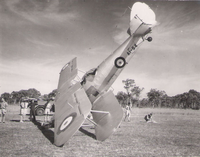 Hawker Demon A1-54 piloted by Bronte Pannell (242) crashed onto its nose at Pearce in Western Australia on 18 March 1939. It would appear that the brakes had been applied too enthusiastically after landing.