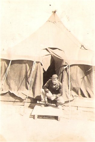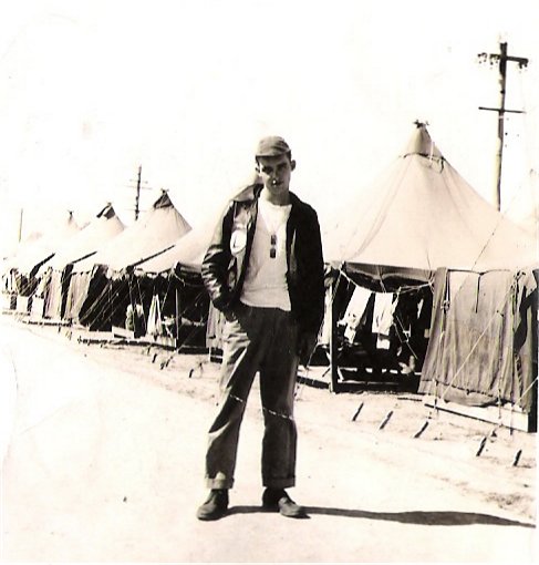 Jack Seese in front of Radio Operator's tents, Garbutt Field, Townsville, 1944