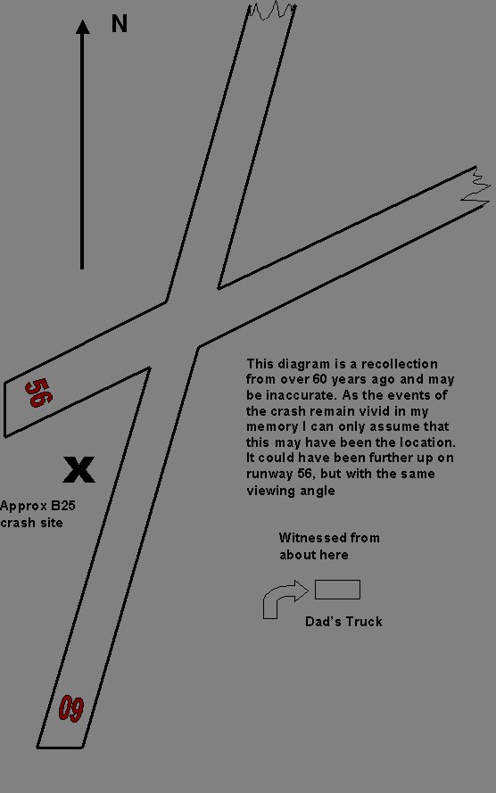 Someone yelled out – “All down, there might be bombs on it”. It fell to the ground at the side of the runway and burst into flames. You could see some of the men getting thrown out. Next thing, the big yank from the workshop came racing down in a big ten wheeler and threw a wire rope around the tail of the plane and broke it away from the main body. The gunner who was still in there was the only one saved, the others were lying around like roasted pigs poor fellows. (see diagram below)