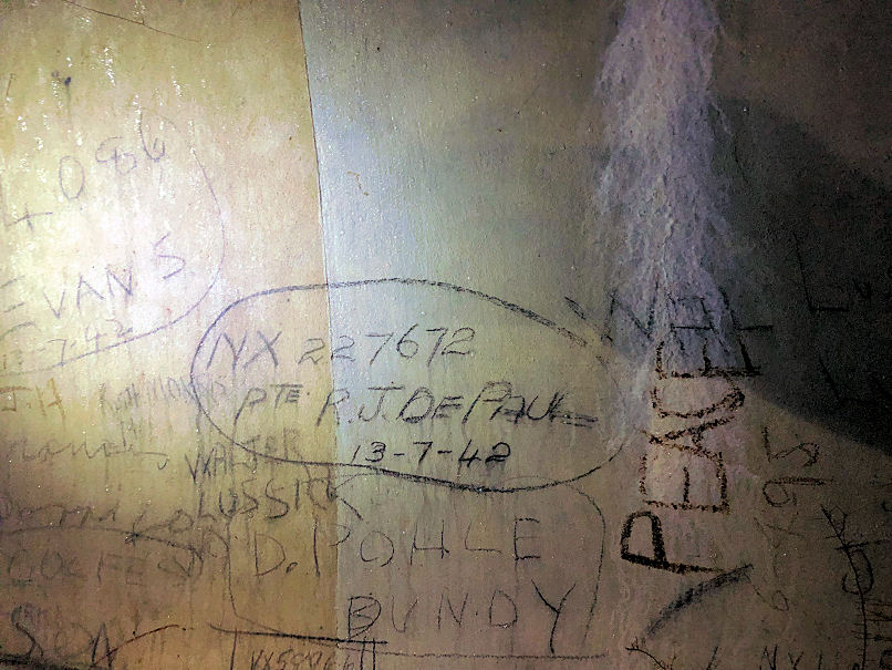 The graffiti which reads "NX227672 Private R.J. De Pau 13 - 7 - 42", was written by Ronald Jack De Pau, who enlisted at Burwood, New South Wales on 22 June 1942, less than a month before he wrote his name on the wall of the tunnel. He was discharged from the RAA 11th Division as a Corporal on 27 March 1946.
