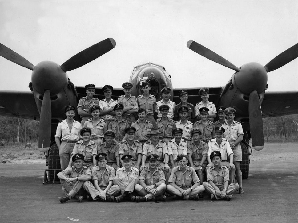 Group portrait of ground crew in front of a PR Mk XVI-Mosquito, 87 PR Squadron, RAAF, August 1945