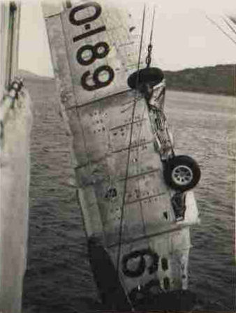 The main fuselage of the wrecked Wirraway being lifted on board HMAS Orara