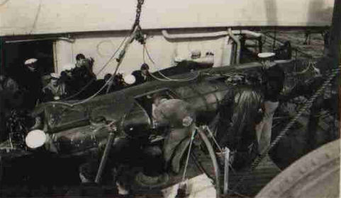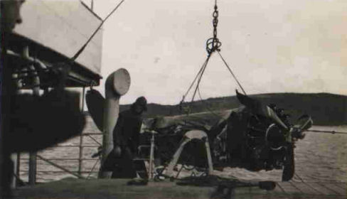 The main fuselage of the wrecked Wirraway being laid on the deck of HMAS Orara