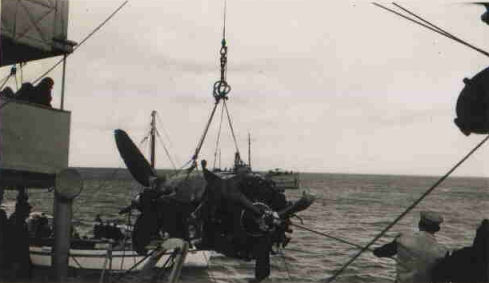The engine from Wirraway A20-189 being lifted on board HMAS Orara