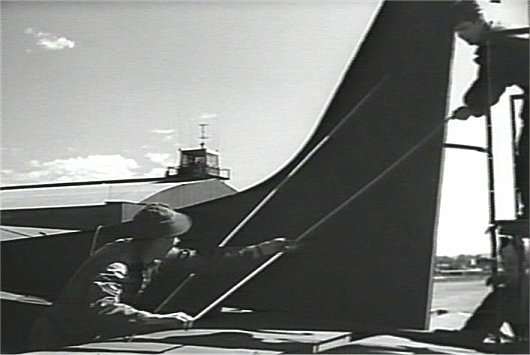 In the film, you can clearly see a single caster wheel which has been fitted to the cockpit of the gliders as the glider noses down on the ground when it is first towed by the C-47 due to the excessive weight on the nose due to the engine. It rolls along the ground on the nose wheel just until enough speed is gathered to create lift to pull the nose back up! Jim believes they have done this before and were very aware of the problem of towing an aircraft engine inside a CG-4A. The C-47 pilot says that his transported aircraft engine was to then be flown over the Coral Sea to Port Moresby, but was not due to the C-47's engines being burnt up. The glider pilot recalls that the engine he towed was to go to Townsville for a P-40 Warhawk.