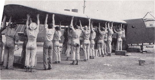 28 men ready to lift the wing on to the fuselage of the glider in the