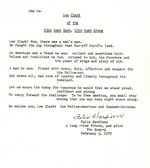 Ode to Lee N. Clark by Felix Hardison, pilot of Suzy-Q