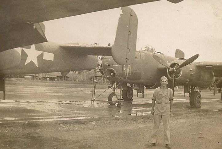 Unknown serviceman in front of B-25 Mitchell bombers at No. 2 Air Depot, Townsville