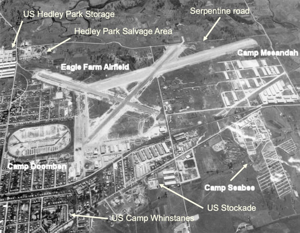 I was told that this facility was built in 1942 for the American Army and each building had a floor area of 2503m². This area held the cargo of a Liberty ship which unloaded at the wharves at the end of Nudgee Road. (I presume it was Brett’s Wharf). The cargo was transported up Nudgee Road and unloaded into the shed. The shed was then closed and the goods flown out to their Pacific bases when needed. As Eagle Farm airport was just to the east it was once again close. I have an aerial photo of the area but at present cannot locate it. It is quite old. Am sure it shows the end of the runway.