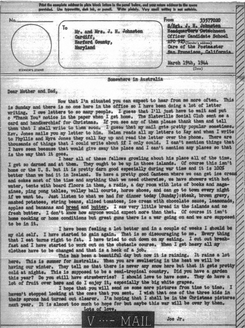 S/Sgt. Joe H. Johnston had been in New Britain before he was sent to Officer Candidate School (OCS) at Camp Columbia. Because of a delay in transportation he was too late for his original intended class and he was temporarily attached to Headquarters Company. Compared to a fox hole in New Britain, Camp Columbia was a near paradise for S/Sgt. Joe H. Johnston. After he graduated from OCS Joe Johnston was assigned to the 43rd Infantry Division at Aitape in New Guinea in preparation for the invasion of the Philippines.