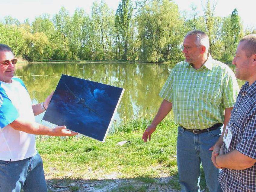 The plane went down on its way back home from Pilzen, CSSR, on April 17, 1943. It crashed near the recent village of Oggersheim, a suburb of Ludwigshafen, Germany. Parts of the engine were recently found in a nearby pond of a local fishing club. As only six bodies were recovered, one is presumably missing in action. The Arbeitsgemeinschaft Vermißtenforschung (our group) tries to locate and recover the remains of both plane and crew member in the near future.